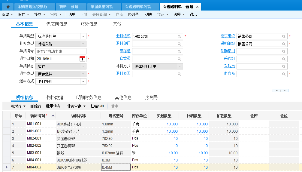 # 封面封底(制作6)副本 **金蝶云采购管理操作手册** 目录 [1](#_Toc525221084) [1. 采购管理系统 4](#_Toc525221085) [1.1采购管理概述 4](#_Toc525221086) [1.2业务流程图 4](#_Toc525221087) [1.2.1 标准采购 4](#_Toc525221088) [1.2.2 采购退料 5](#_Toc525221089) [1.2.3 跨组织采购 5](#_Toc525221090) [2.基础设置 6](#_Toc525221091) [2.1参数设置 6](#_Toc525221092) [2.1.1系统参数 6](#_Toc525221093) [2.1.2 单据类型参数 6](#_Toc525221094) [2.2物料设置 7](#_Toc525221095) [2.2.1 基本控制 7](#_Toc525221096) [2.2.2 采购控制 8](#_Toc525221097) [2.3 供应商资料 9](#_Toc525221098) [2.3.1 基本信息维护 9](#_Toc525221099) [2.3.2 供应商资料分配 9](#_Toc525221100) [2.4 采购员与采购组 10](#_Toc525221101) [2.5 货源清单 11](#_Toc525221102) [2.6 单据类型与业务流程 12](#_Toc525221103) [3.初始化 13](#_Toc525221104) [3.1 期初采购入库单 13](#_Toc525221105) [3.2 期初采购退料单 14](#_Toc525221106) [4.日常业务处理 14](#_Toc525221107) [4.1 采购申请单 14](#_Toc525221108) [4.2 采购订单 15](#_Toc525221109) [4.2.1 编制订单 15](#_Toc525221110) [4.2.2 交货控制 16](#_Toc525221111) [4.2.3 采购订单预付 16](#_Toc525221112) [4.3 采购订单变更 17](#_Toc525221113) [4.4 收料通知单 17](#_Toc525221114) [4.5 采购入库单 18](#_Toc525221115) [4.6 采购退料单 18](#_Toc525221116) [4.6.1 退料申请单 18](#_Toc525221117) [4.6.2 采购退料单 19](#_Toc525221118) [4.7 VMI采购业务 20](#_Toc525221119) [4.7.1 整体业务流程 20](#_Toc525221120) [4.7.2 批量创建消耗汇总 20](#_Toc525221121) [4.7.3 消耗汇总表 21](#_Toc525221122) [4.7.4 物权转移单 21](#_Toc525221123) [4.8 配额下单 22](#_Toc525221124) [4.8.1 货源清单 22](#_Toc525221125) [4.8.2 配额下单 22](#_Toc525221126) [5.常用功能及业务处理 23](#_Toc525221127) [5.1 采购价格管理 23](#_Toc525221128) [5.2 采购折扣管理 23](#_Toc525221129) [5.3 采购调价管理 24](#_Toc525221130) [5.4 跨组织采购 24](#_Toc525221131) [6.报表查询 25](#_Toc525221132) [6.1 采购订单执行明细表 25](#_Toc525221133) [6.2 采购业务汇总表 26](#_Toc525221134) [6.3 采购订单全程跟踪 27](#_Toc525221135) [6.4 采购入库结算汇总表 27](#_Toc525221136) [6.5 预计供应量查询 28](#_Toc525221137) [6.6 订单到货及时率查询报表 28](#_Toc525221138) # 采购管理系统 ## 1.1采购管理概述 采购是指企业在一定的条件下从供应市场获取产品或服务作为企业资源, 以保证企业生产及经营活动正常开展的一项企业经营活动。 金蝶云采购管理系统,是通过采购申请、采购订货、进料检验、仓库收料、采购退货、采购货源管理、订单管理等功能综合运用的管理系统,对采购商流和物流的全过程进行有效控制与跟踪,实现完善的企业物资供应管理。 采购管理系统与销售管理系统、库存管理系统集成,共同构造企业内部供应链。采购管理系统与计划管理系统、生产管理系统集成建立产供销一体化,有效平衡供应和需求。采购管理系统与应付管理系统、资金管理系统集成,形成采购与应付循环,有力的支撑业务财务一体化。 ## 1.2业务流程图 ### 1.2.1 标准采购  ### 1.2.2 采购退料  ### 1.2.3 跨组织采购  # 2.基础设置 在系统使用前,我们需要先做基础设置。 ## 2.1参数设置 ### 2.1.1系统参数 Cloud的参数设置有多个层级:数据中心层级、业务组织层级、单据层级。功能菜单的采购管理下的参数设置为组织级参数,针对不同采购组织可以设置不同的参数。 定义采购系统参数,在数量、货源、退料、变更等方面设定采购规则。 采购参数设置后可以修改,以参数修改时间为时间点,只影响参数修改后新增的单据。 产品路径:【供应链】->【采购管理】->【参数设置】->【采购管理系统参数】 参考图片如下:  ### 2.1.2 单据类型参数 单据类型上也有相应的控制参数,主要作用是,不同单据类型可以实现不同的业务控制。只影响对应的单据类型。 产品路径:【基础管理】->【基础资料】->【单据类型】->【单据类型列表】 参考图片如下:  ## 2.2物料设置 ### 2.2.1 基本控制 物料是原材料、半成品、产成品等企业生产经营资料的总称,是企业经营运作、生存获利的物质保障,物料资料的设置也成为设置系统基本业务资料的最基本、最重要的内容。 物料包括:基本、库存、销售、采购、计划、生产等页签。每一个标签页分别保存与某一个主题相关的信息。比如说,计划标签页用于保存MRP计划运算需要使用到的物料资料,采购页签用于保存采购管理需要使用到的物料资料。 产品路径:【基础管理】->【基础资料】->【主数据】->【物料】 参考图片如下:  ### 2.2.2 采购控制 物料的采购页签上定义了物料在采购上的一些控制比如:是否必须请购,是否需要控制货源、是否进行配额管理,采用哪种配额方式等等。另外,Cloud系统中将采购计价单位与采购单位区分,有别于WISE系统,这样设计更符合企业的实际。采购计价单位即是用于物料定价的单位。在业务单据中系统自动取价时,会根据采购单位和计价单位进行自动换算。 产品路径:【基础管理】->【基础资料】->【单据类型】->【物料】->【采购页签】 参考图片如下:  ## 2.3 供应商资料 ### 2.3.1 基本信息维护 维护供应商的基本信息,与供应商交易时的默认币别、结算方式、收款条件等;设置供应商默认对应的销售人员、价目表、折扣表等。维护好这些基本信息系统会在单据上自动携带,可以节省录单时间。 供应商资料上组织信息页签的地点、地址信息,是指客户企业存在多组