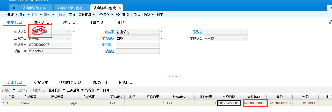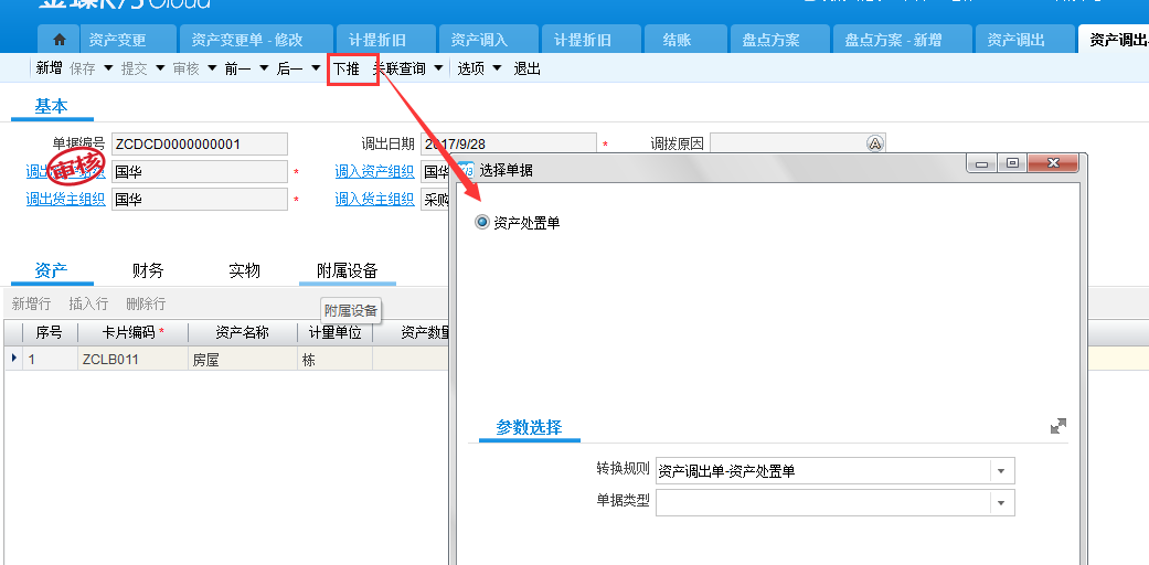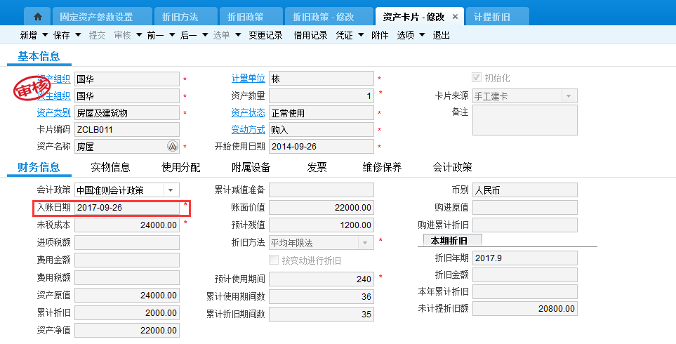 **金蝶软件(中国)有限公司** **2024年4月18日** 密级:★高★版本:1.0 文档控制: 金蝶云固定资产操作手册 更改记录 日期 作者 版本 更改参考/备注 200 目 录 [一. 固定资产采购 4](#_Toc80352776) [1 业务流程 4](#_Toc80352777) [2 业务数据 4](#_Toc80352778) [二. 固定资产日常管理 9](#_Toc80352779) [1. 固定资产新增 9](#_Toc80352780) [2. 固定资产处置 14](#_Toc80352781) [3. 固定资产变更 14](#_Toc80352782) [4. 固定资产领用及借用 17](#_Toc80352783) [5. 固定资产挪用 18](#_Toc80352784) [三. 固定资产盘点 21](#_Toc80352785) [1 业务流程 21](#_Toc80352786) [2 业务数据 22](#_Toc80352787) [四. 固定资产折旧计提 24](#_Toc80352788) [1. 固定资产固定折旧 24](#_Toc80352789) [2. 固定资产变动折旧 25](#_Toc80352790) [五. 固定资产期末处理 26](#_Toc80352791) [1. 生成凭证 26](#_Toc80352792) [2. 结账 27](#_Toc80352793) 1. 固定资产采购 # 业务流程  # 业务数据 2.1创建物料 产品路径:基础资料-主数据-物料 注:只有物料属性为资产的物料才能做资产申请单。 系统默认资产物料不入库,如果客户实际业务需要入库,那么在新建资产物料时一定要允许库存。  2.2 资产申请单(可选) 产品路径:资产管理-固定资产-资产请购-资产申请单 资产需求采购部门在系统中创建资产申请单,填写需求组织、需求部门、需求人、所需资产物料(物料属性为资产),数量及到货日期并提交审核。  2.3 采购申请单 产品路径:采购管理/资产管理-采购申请-采购申请单 当需求人员做了资产申请单的情况下,首先调整采购申请单的单据类型为资产采购申请单,再通过选单的方式创建采购申请单,选择采购组织、录入推荐供应商(可选)提交审核。  若需求人员不做资产申请单,可以直接创建采购申请单来达到申请的需要,单据类型为资产采购申请单,手动填写资产申请组织及部门、采购组织、物料、数量、到货日期、及建议供应商(可选)并提交审核。  2.4 采购订单 产品路径:供应链-采购管理-采购申请-采购申请列表-下推采购订单 采购员填写单价并提交审核。  2.5采购收料 产品路径:供应链-采购管理-订单处理-采购订单列表-下推操作 采购订单下推收料通知单,若实际业务需要入库且该资产物料设置了允许库存,则填写仓库,否则直接提交审核,没有入库动作的直接看2.8。  2.6 采购入库 产品路径:供应链-采购管理-收料处理-收料通知单列表-下推操作 提交审核  2.7 资产出库 产品路径:供应链-库存管理-杂收杂发-其他出库单 已入库的资产在领用时需要进行出库处理,新增其他出库单,更改单据类型为资产出库,填写领用部门、物料编码、实发数量、发出仓库等信息并提交审核。  2.8资产卡片 产品路径:资产管理-固定资产-日常管理-资产卡片 新增资产卡片,选择正确的资产组织及货主组织(资产组织和货主组织可以不相同即管理资产的组织与实际所有权所属的资产组织不一致,资产组织必须有资产职能,货主组织可以没有资产职能。),选择资产类型后再点击“选单”关联采购收料单或其他出库单。  根据实际需求填写卡片,若一个使用组织使用多个会计政策,则需要在每种政策下,填写财务信息。   字段后有红点的为必录信息,录入后提交审核。 1. 固定资产日常管理 # 固定资产新增 * 1. **业务数据** 产品路径:普通用户-资产管理-固定资产-日常管理-资产卡片 资产卡片为私有基础资料,按照实际使用组织进行创建  注:按变动进行折旧是不可逆操作,请根据自身情况加以选择。 选定好对应的会计政策,有多个会计政策的组织,每个会计政策下都要录入一遍财务信息。  * 1. 开始使用日期为实物资产的实际使用日期,建议早于或等于资产的入账日期,该字段为文本字段不参与实物的财务计算,但会影响累计使用时间。  * 1. 入账日期是固定资产启用期间中的一天  * 1. 财务信息页签下,各字段所代表的内容及注意点。   * 1. 若资产卡片存在一卡多物(同一种物料多数量)的状况,则在实物信息页签中,可以通过资产编码区分不同的实物资产,一般一个资产编码一个实物资产,每个资产编码对应资产位置及数量。 注意:当一张卡片一卡多物的时候,在进行调入等日常管理时,该卡片上的所有东西都要进行该操作,变更频繁的固定资产,不宜一卡多物。  * 1. 若资产卡片存在一物多分配的情况,则在使用分配页签中,针对资产编码设定分配比例。一个资产编码分配比例加一起应该为100%。  * 1. 若还有附属设备、发票内容、维修保养需要记录,都可以放在附属设备、发票、维护保养页签中,此处仅作为管理需求存在,不影响财务计算。  # 固定资产处置 * 1. **业务数据** 产品路径:资产管理-固定资产-日常管理-资产处置单 当用户需要对固定资产进行出售等处置处理时,新增资产处置单,选择资产组织及货主组织,选择卡片编码,填入所需费用及得到的收入,确定实物分录,并进行提交、审核操作。 注:在做本月资产处置单之前不要做本月的计提折旧。  # 固定资产变更 * 1. **业务数据** 产品路径:资产管理-固定资产-日常管理-资产变更单 新建资产变更单,首先选择资产组织及货主组织,选择卡片编码(只显示该资产组织及货主组织下的卡片编码,若没有需要的卡片编码,确定组织的正确性)根据实际情况填写变更数据,可变更的内容可详见各页签下信息,并提交审核。   注:当资产做非财务变更不需要做新的折旧计提,当资产财务变更的